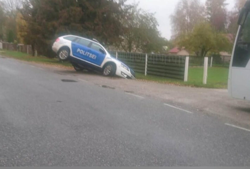 Kosel juhtus täna hommikul tavapäratu õnnetus – tee äärde pargitud politseiauto vajus nii õnnetult kraavi, et tagumine ots tõusis üles.