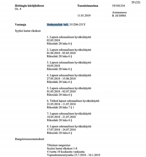 Helsingi kohus mõistis 4 aastaks ja 10 kuuks vangi 1986. aastal sündinud Hedayatullah Safin’i, kes oli 2018. aastal kasutanud seksuaalselt ära ja vägistanud 8 soome last, kellega võttis ühendust sotsiaalmeedia kaudu.